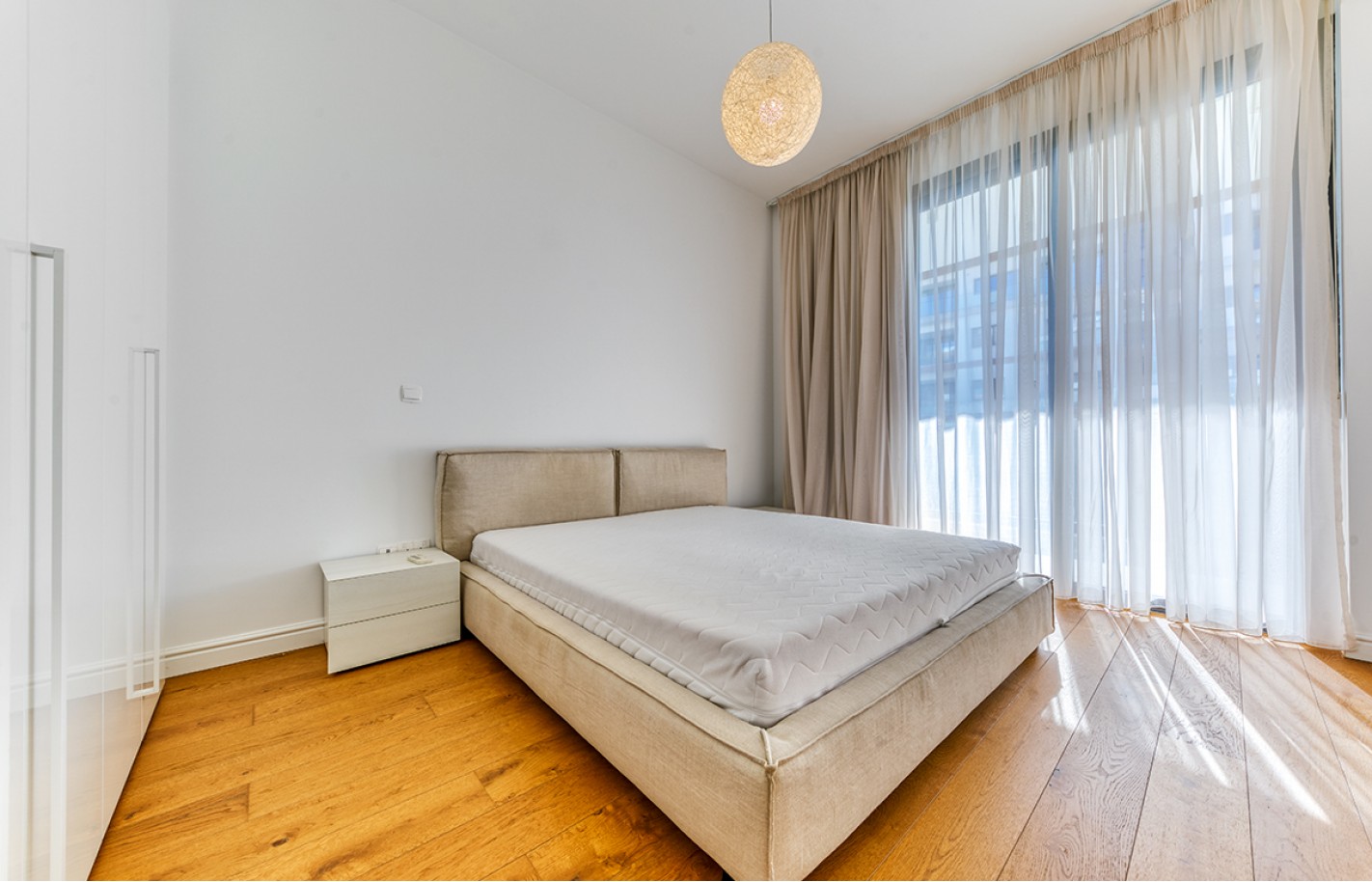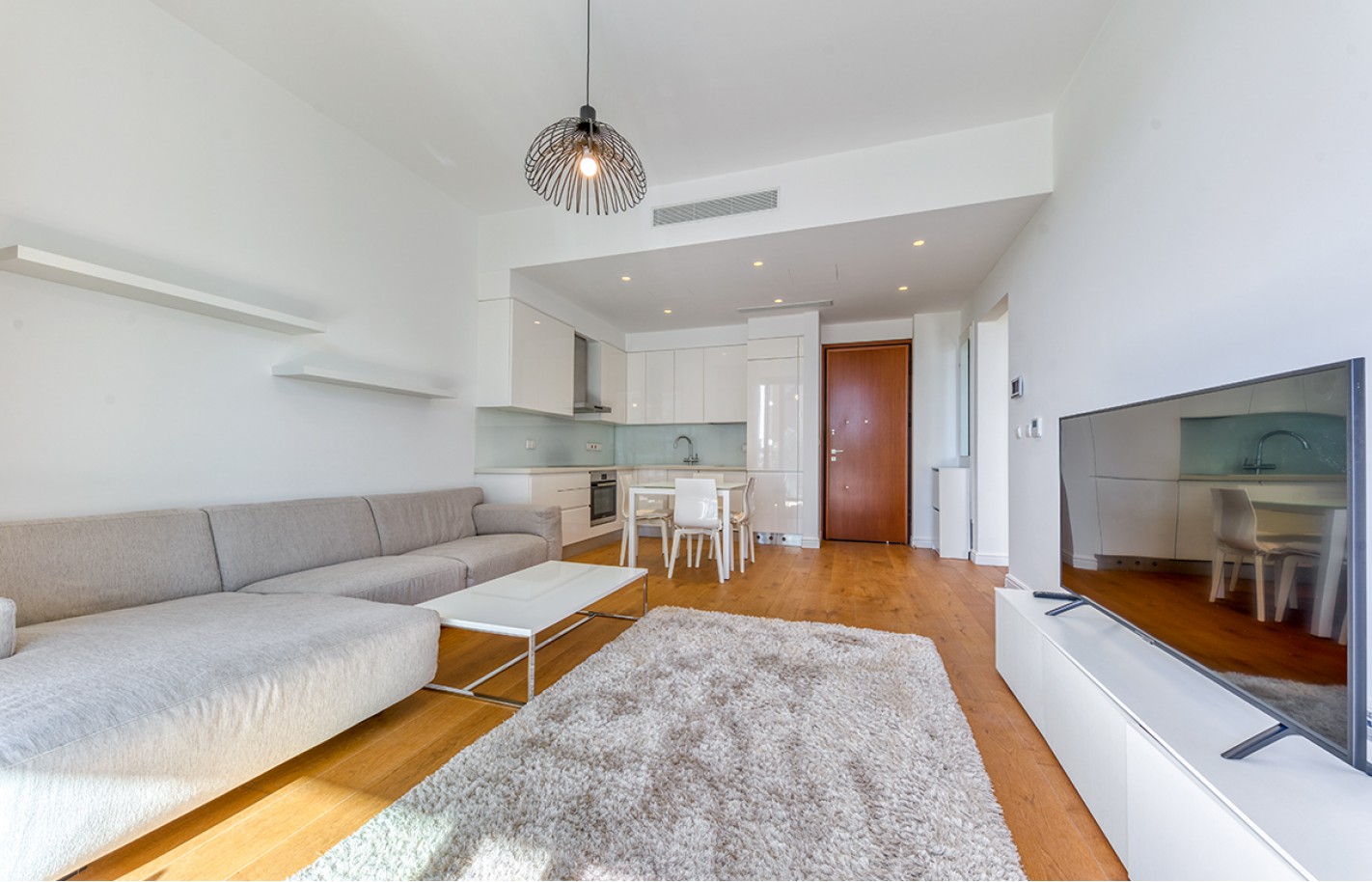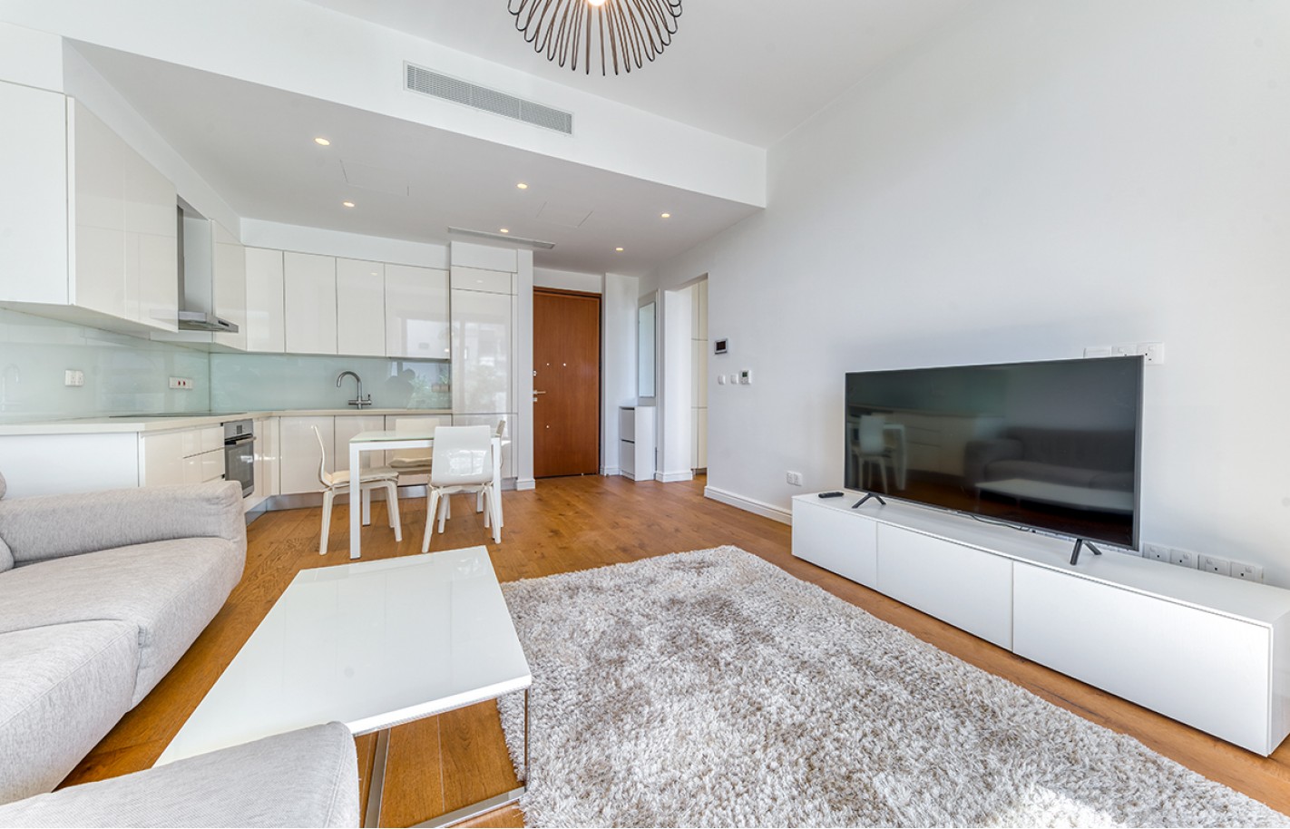 The 76 m² apartment includes a spacious bedroom and a functional layout with a balcony where you can relax and enjoy the sea view. Underfloor heating and a fully equipped kitchen make living as comfortable as possible.