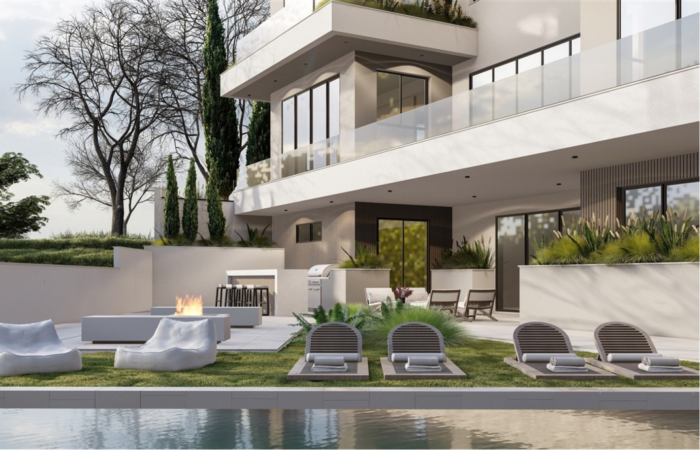The layout includes five spacious bedrooms, large windows creating a bright and cozy atmosphere, while balconies and a private pool expand the space for relaxation and family gatherings.