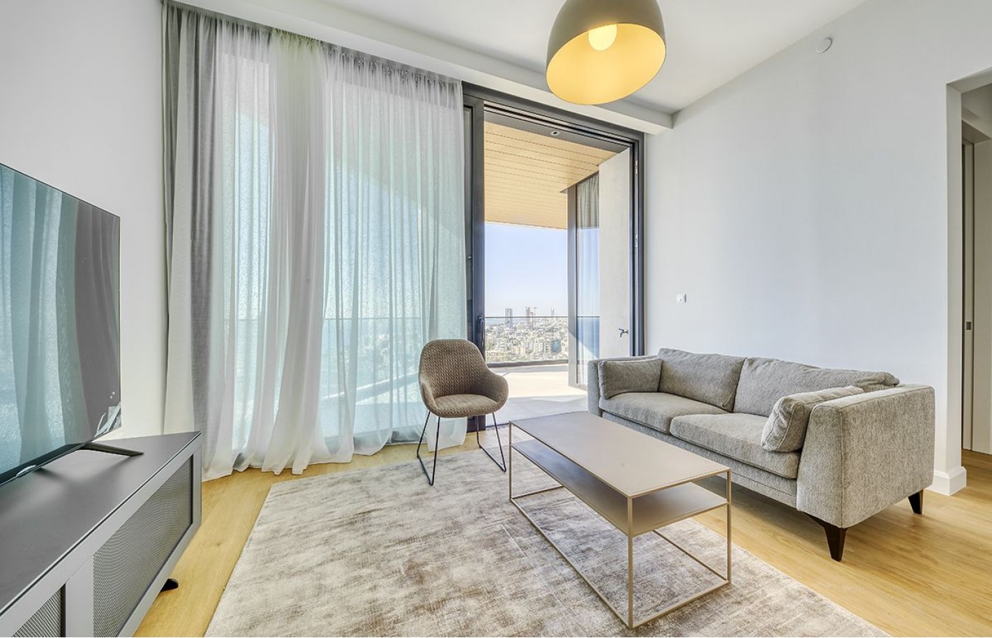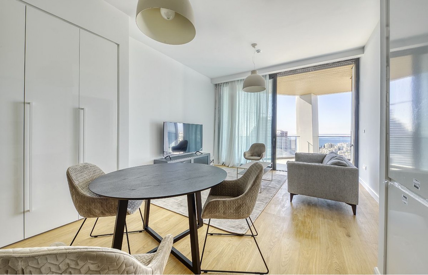 Внутренняя планировка площадью 77 м² включает одну спальню и оборудованную кухню. Апартаменты полностью меблированы и оснащены техникой, включая кондиционер, посудомоечную машину и систему безопасности, что обеспечивает комфорт с первых дней.