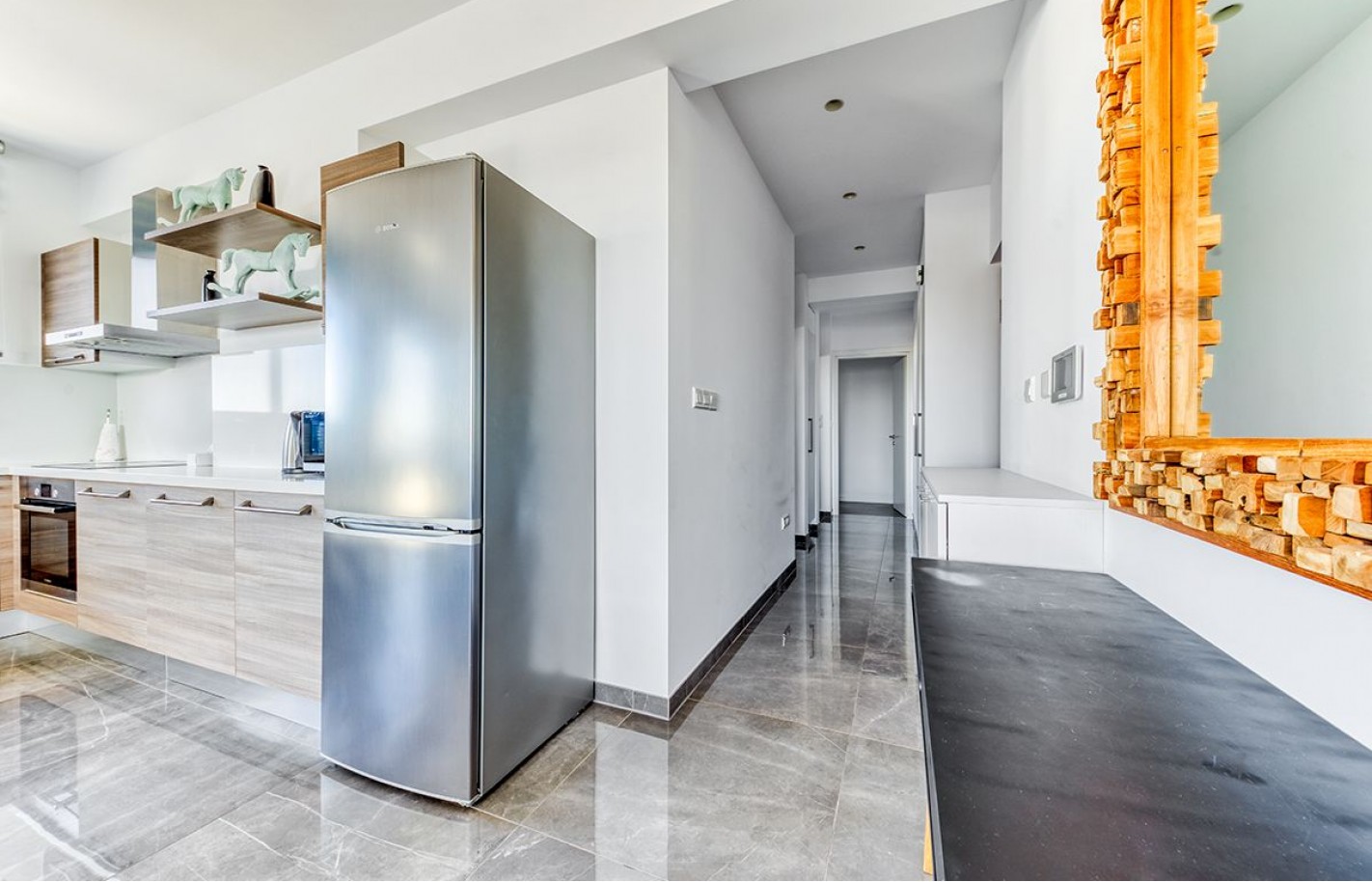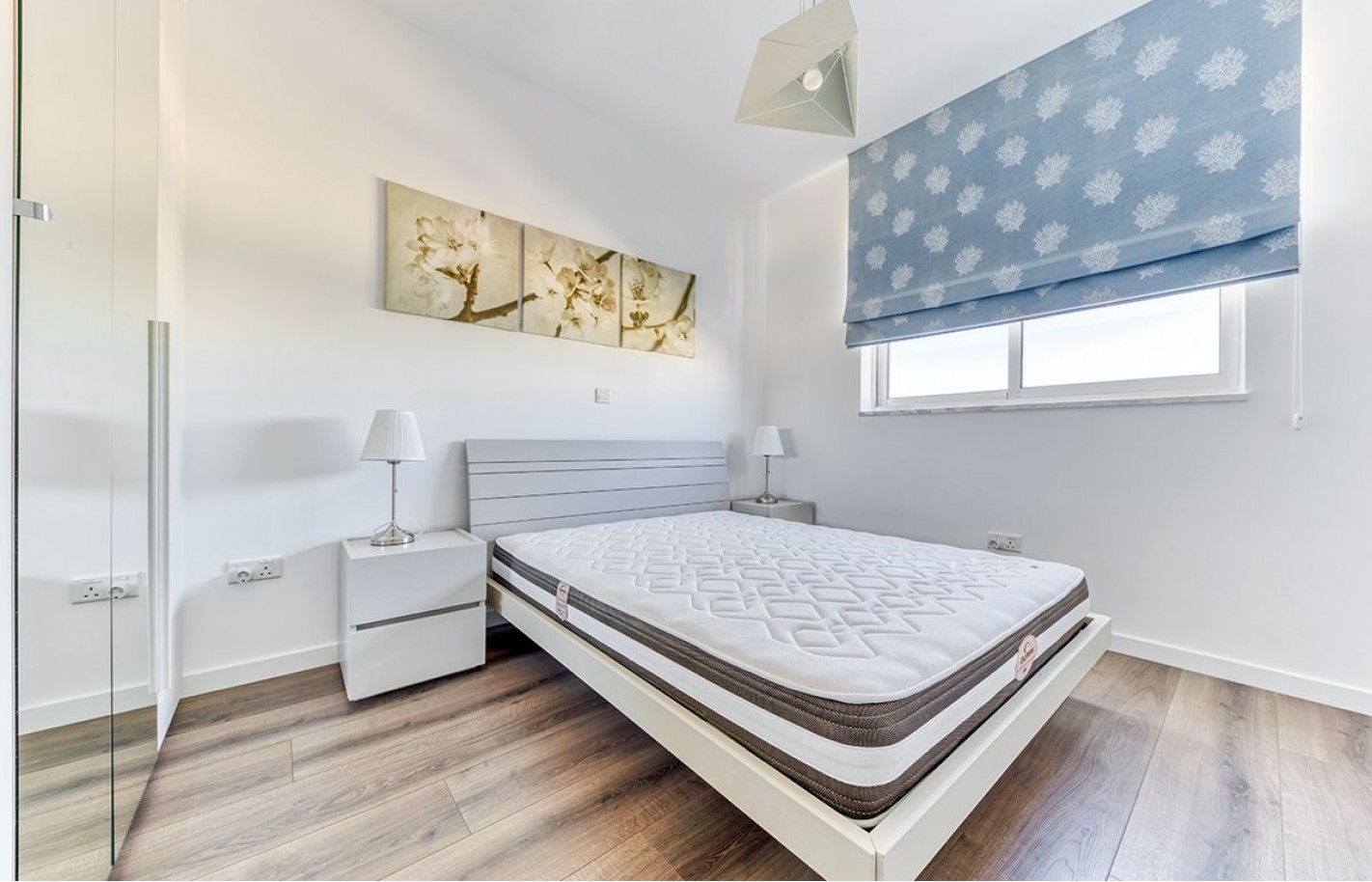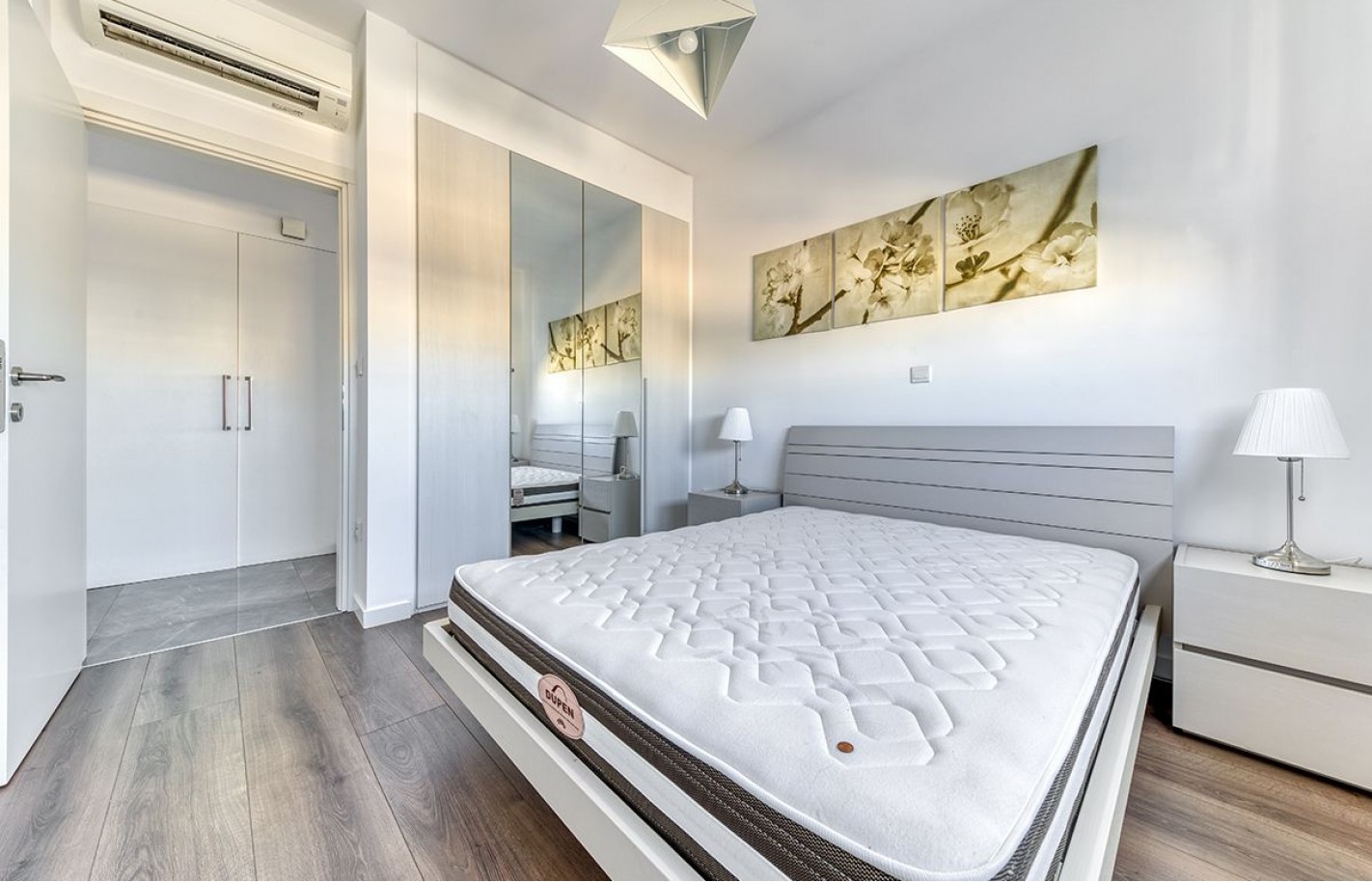 Просторные 160 квадратных метров включают две спальни, оснащённые системами кондиционирования и подогрева пола. Свет проникает через большие окна, а балкон расширяет жилое пространство, открывая виды на окрестности.