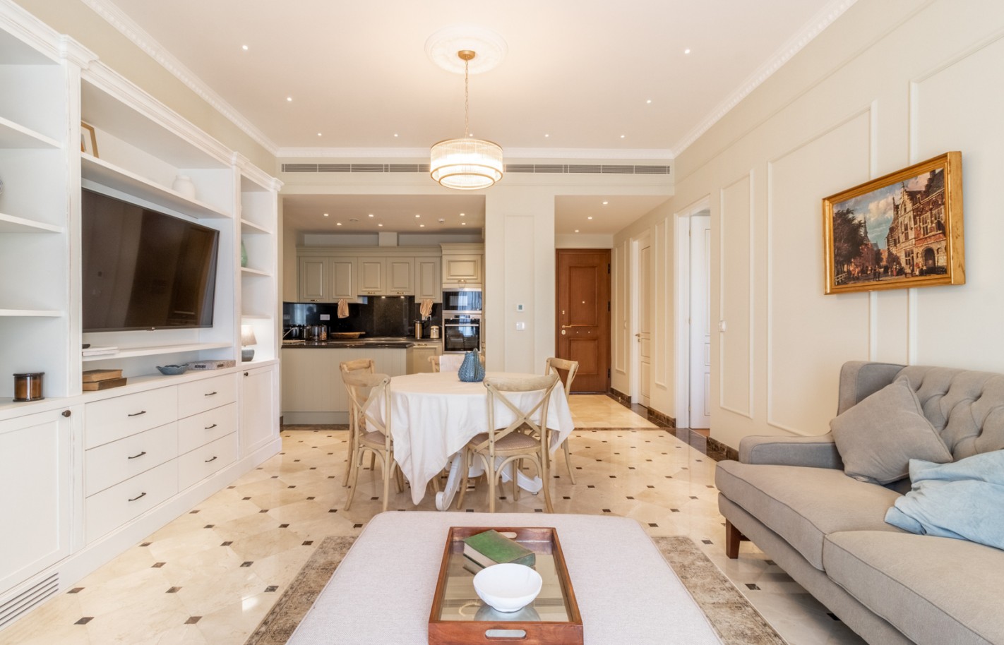 Просторная планировка включает четыре спальни и три ванные комнаты, а большие окна и балконы наполняют пространство светом и морским воздухом. Обустроенная кухня и наличие всех необходимых бытовых приборов создают удобство для жизни и отдыха.