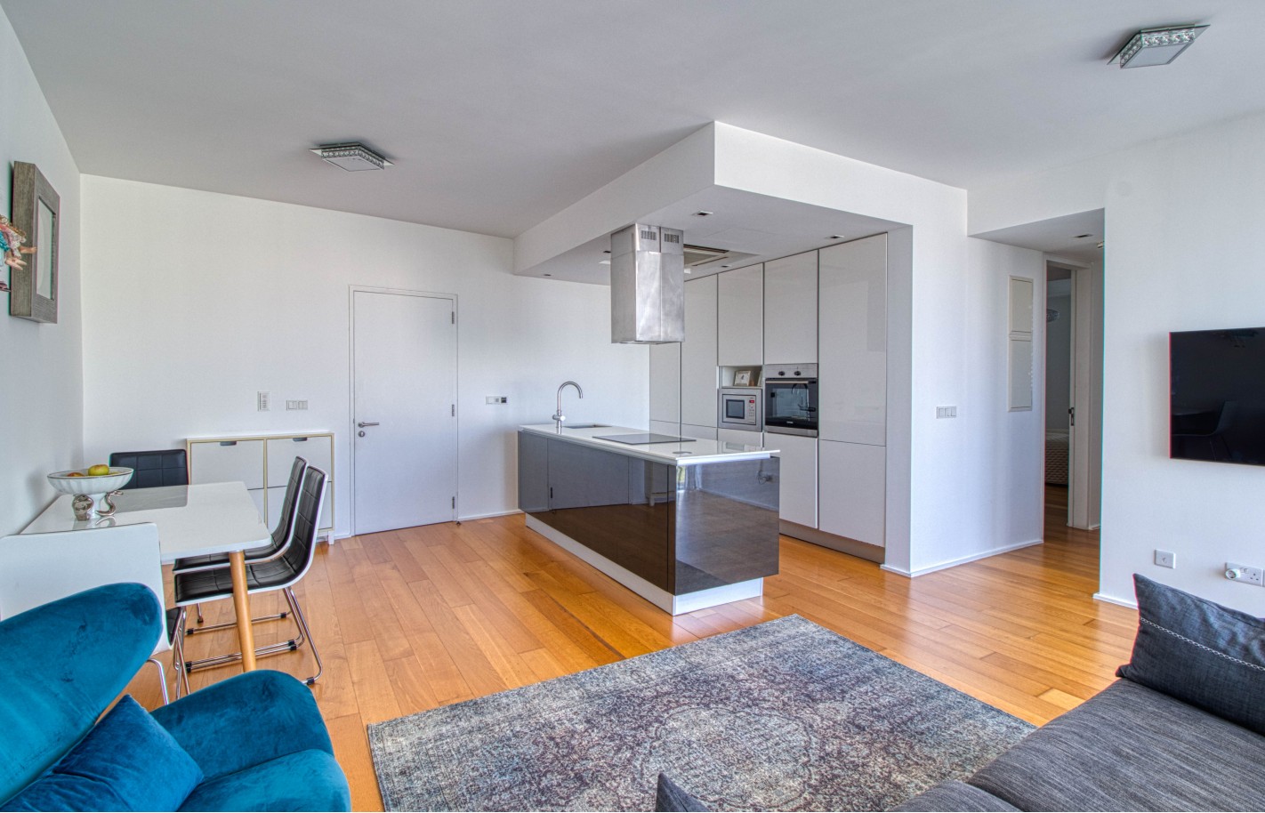 Внутри квартиры — просторные 100 м² с двумя спальнями и двумя ванными. Большие окна и балкон наполняют пространство светом, а оснащённая кухня и техника создают комфорт для ежедневной жизни.