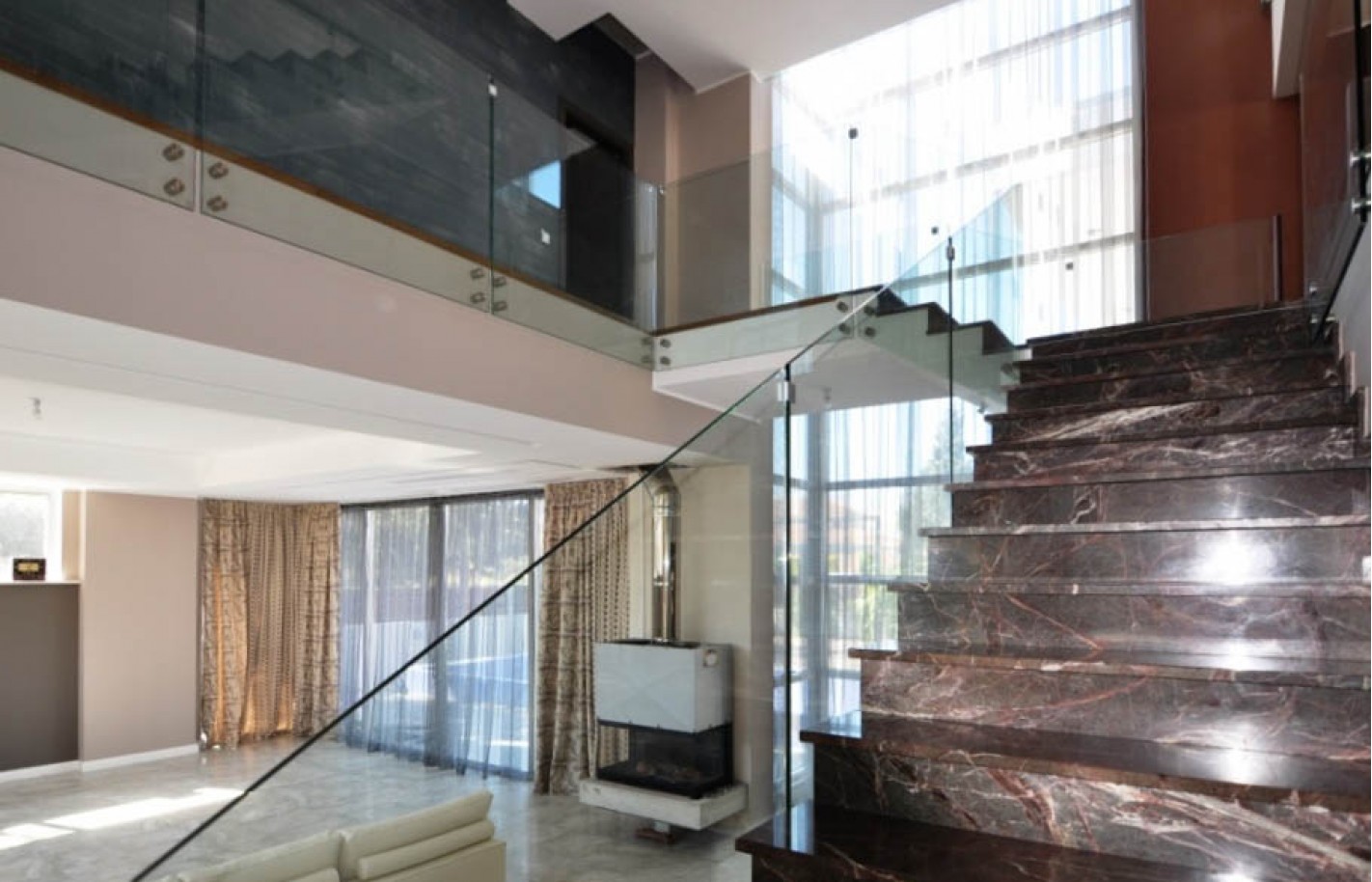 Внутри — пять просторных спален, просторная гостиная с камином, оборудованная кухня и балкон с видом. Продуманное освещение и функциональная планировка создают ощущение простора и комфорта.