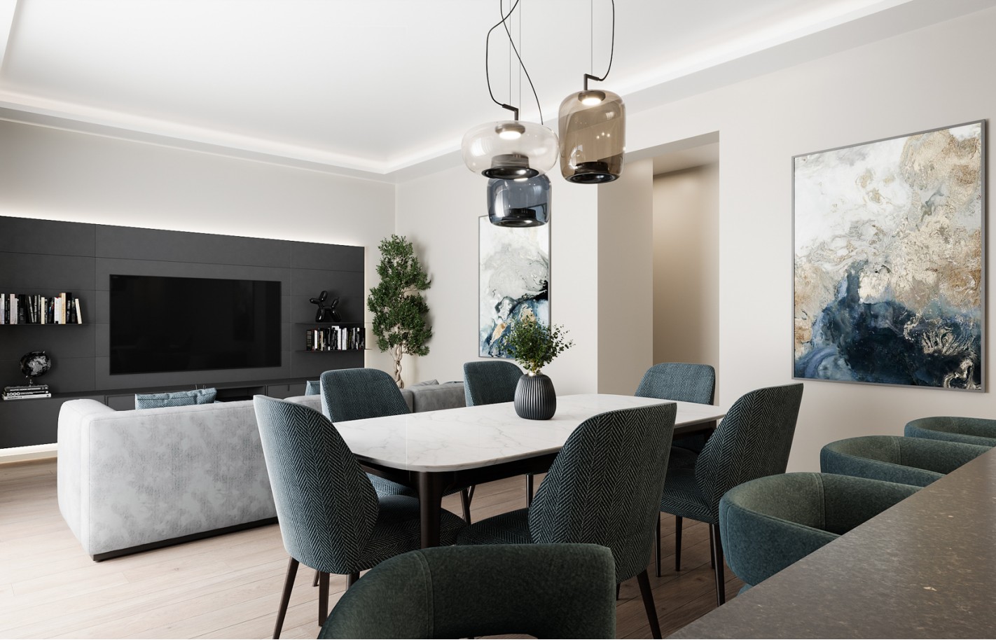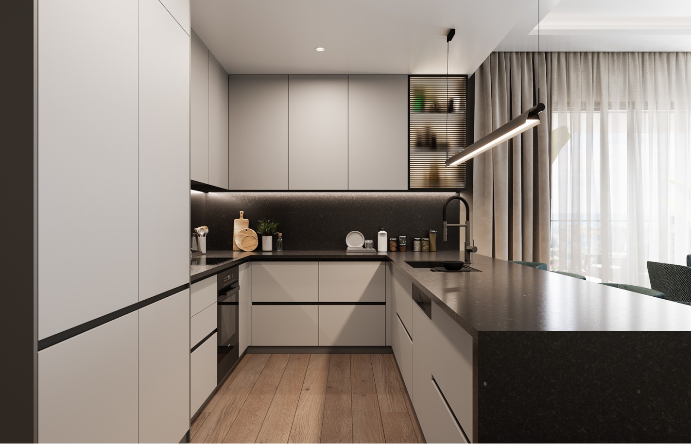 Апартаменты включают три спальни, продуманную планировку с балконом и обустроенной кухней, поддерживаемую системой кондиционирования и полом с подогревом для вашего комфорта.
