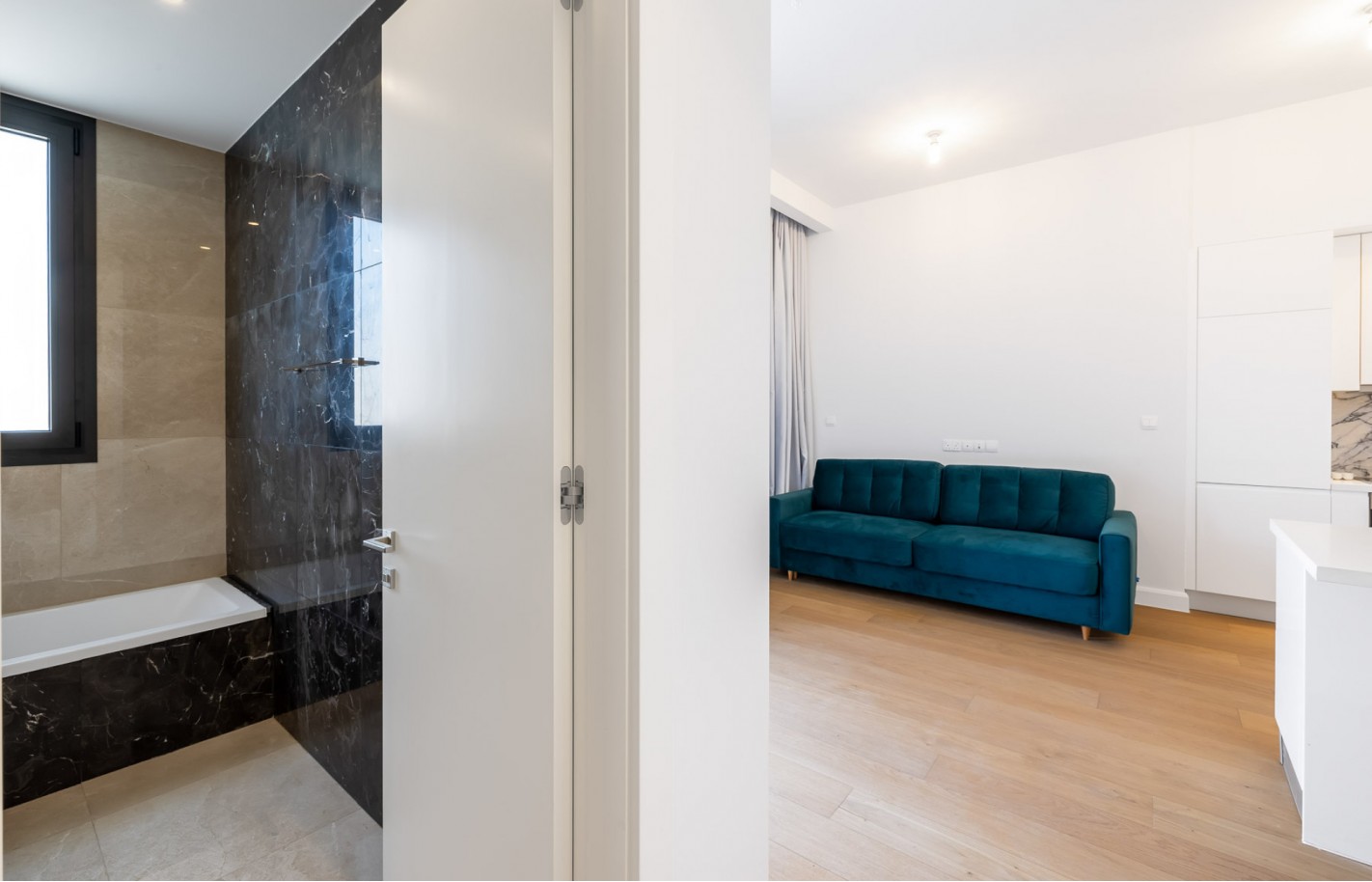 Внутри апартаментов — просторная планировка с большим окном и балконом, полностью меблированная и оснащённая системой кондиционирования, полом с подогревом и солнечными батареями. Кухня оборудована всей необходимой техникой для удобства повседневной жизни.