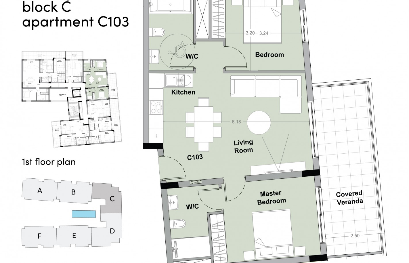 Внутри — две светлые спальни и просторные жилые зоны с естественным освещением. Балкон расширяет жилое пространство, позволяя наслаждаться видами и свежим воздухом, а продуманная планировка учитывает ваши потребности.