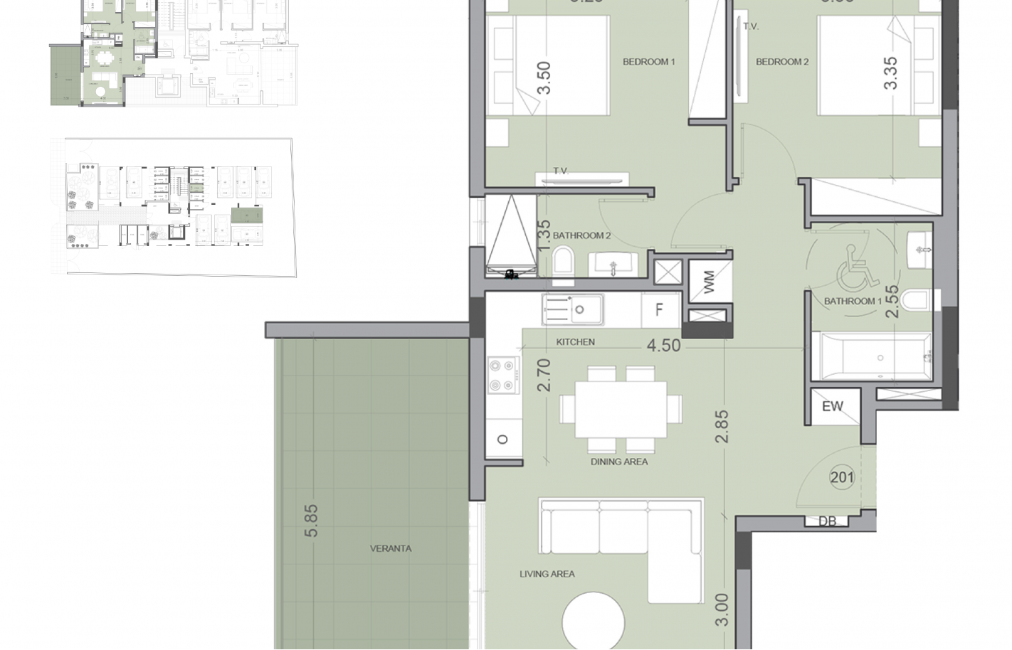 Апартаменты включают две спальни и оборудованную кухню, что создаёт удобство для постоянного проживания. Большие окна наполняют комнаты светом, а кладовая помогает организовать хранение.